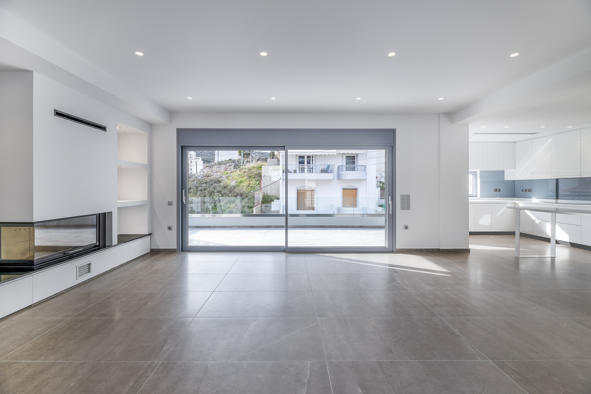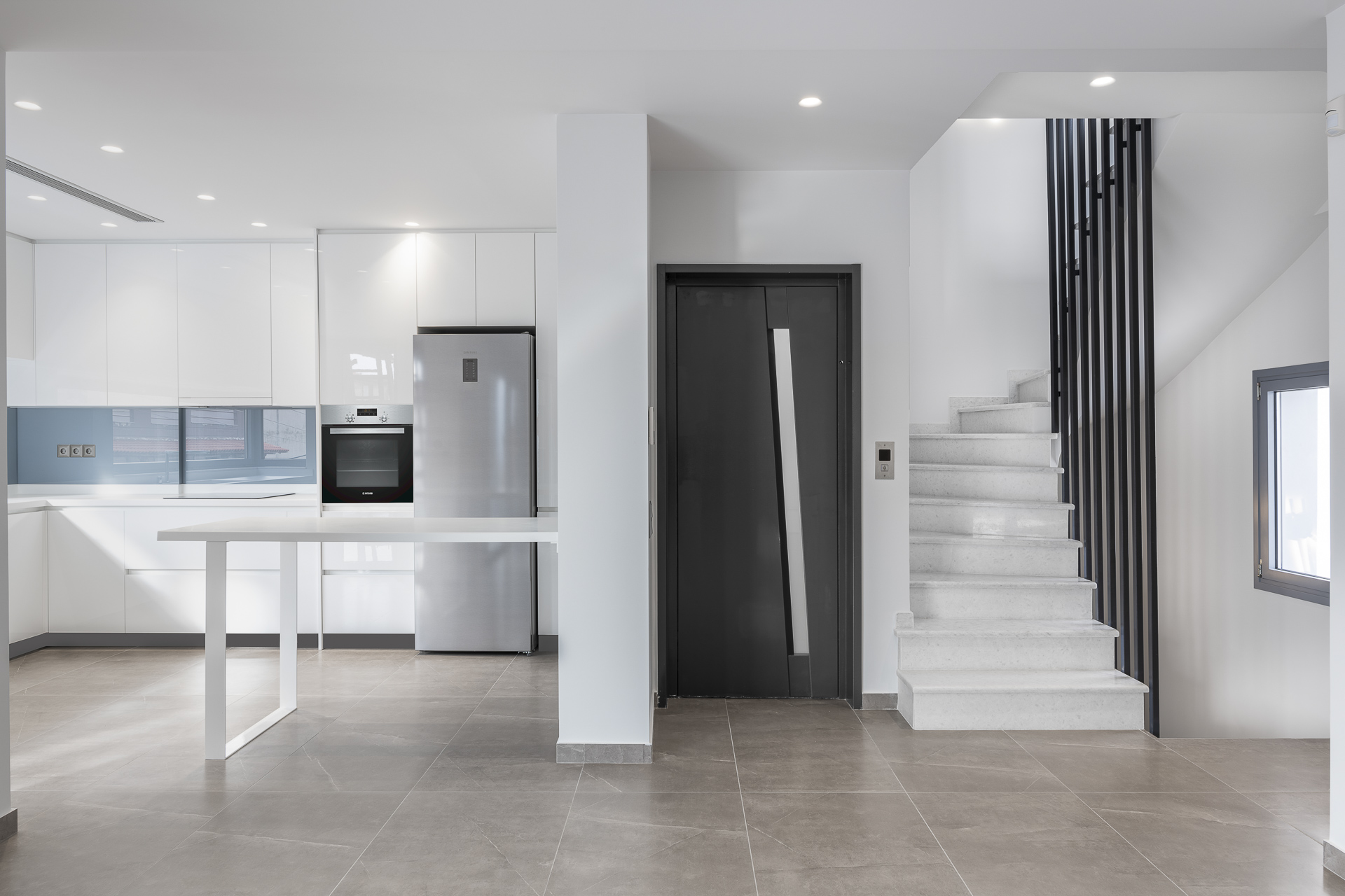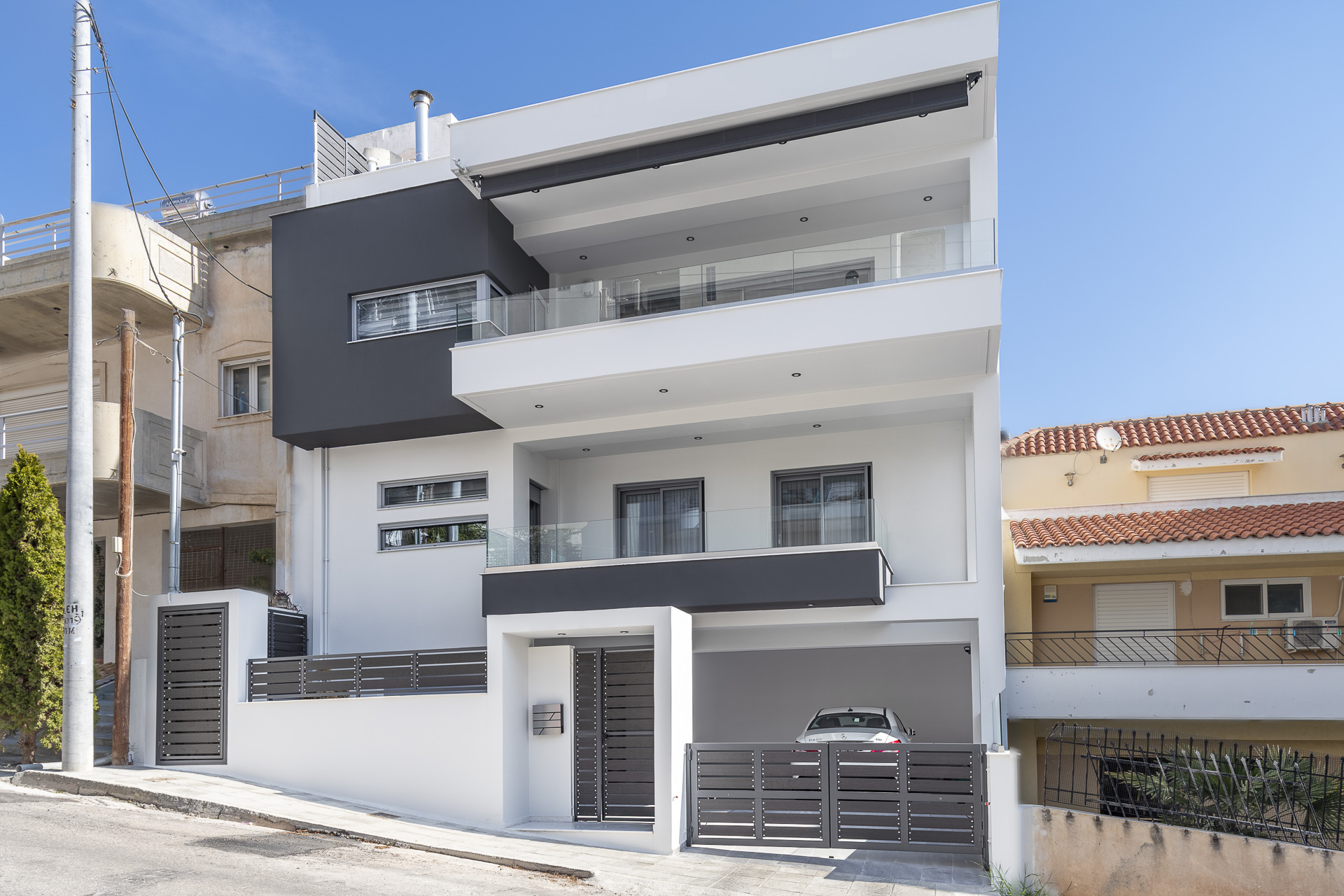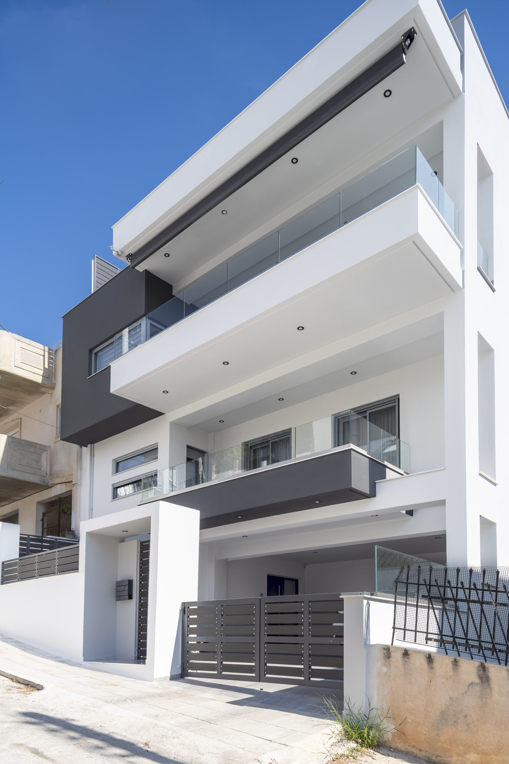 Η μονοκατοικία στην Νεάπολη τοποθετείτε σε ένα οικόπεδο με έντονες υψομετρικές διαφορές. Στο υπόγειο βρίσκεται ένα ιδιωτικός χώρος playroom-γυμναστήριο και οι βοηθητικοί χώροι της κατοικίας, στο ισόγειο οι στεγασμένες θέσεις στάθμευσης καθώς και μία αυτόνομη γκαρσονιέρα, στον 1ο όροφο οι χώροι νυκτός και στον 2ο όροφο οι χώροι διημέρευσης. Οι χώροι του δευτέρου ορόφου συνδέονται με έναν μεγάλο εξώστη από τον οποίο υπάρχει ανεμπόδιστη θέα προς τη θάλασσα. Στα στηθαία των εξωστών έχουν τοποθετηθεί κρύσταλλα ώστε να μπορούν οι ιδιοκτήτες να απολαύσουν τη θέα από το εσωτερικό της κατοικίας. Βασική αρχιτεκτονική σχεδιαστική αρχή ήταν η διαμόρφωση απλών και καθαρών όγκων στην όψη, minimal αισθητικής. Από το ιδιωτικό κλιμακοστάσιο υπάρχει πρόσβαση στο δώμα όπου έχει δημιουργηθεί ειδική κατασκευή πέργκολας με bbq.