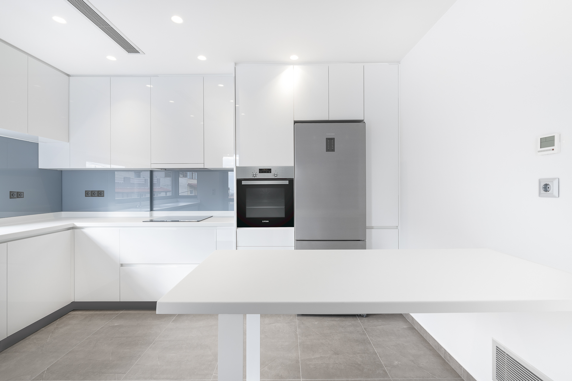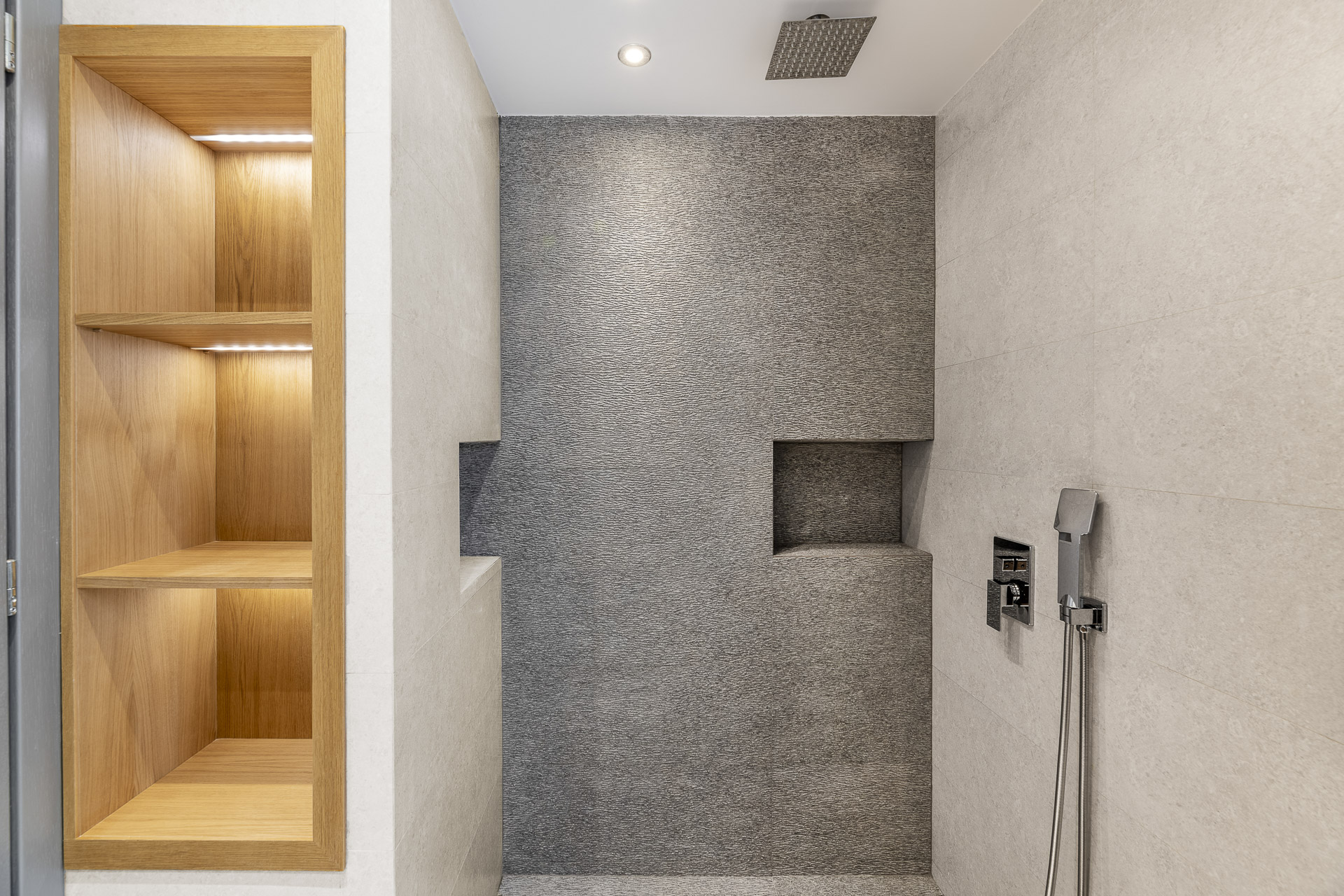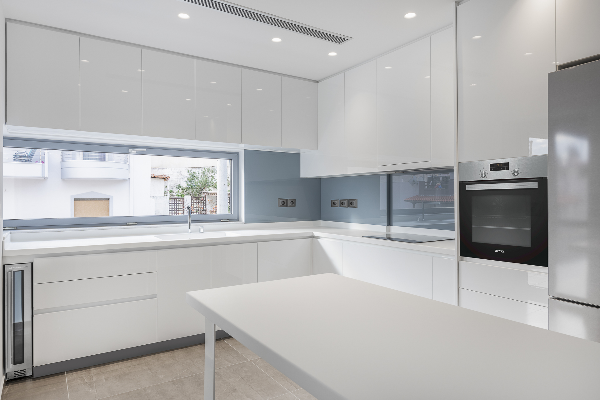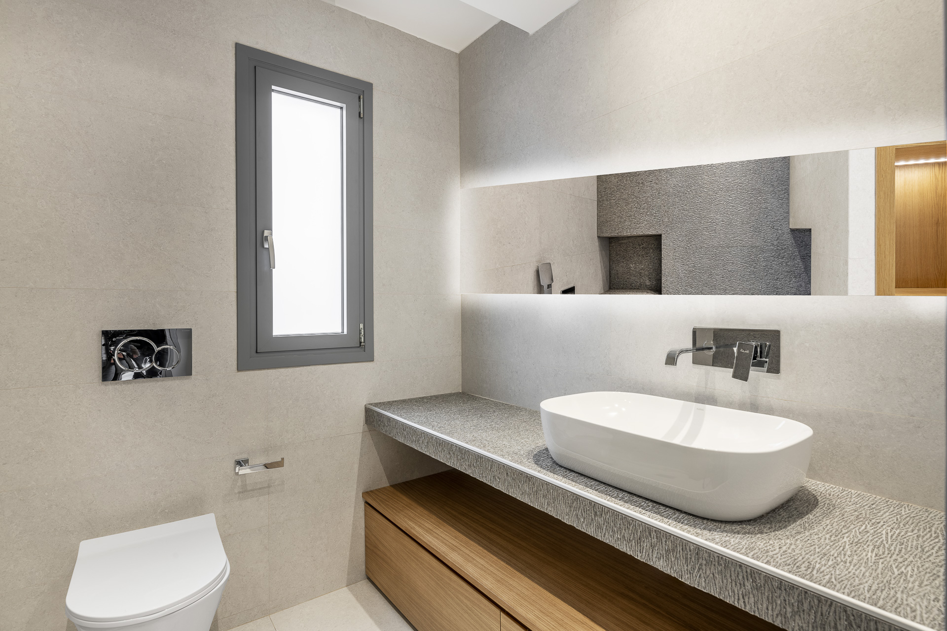 Η μονοκατοικία στην Νεάπολη τοποθετείτε σε ένα οικόπεδο με έντονες υψομετρικές διαφορές. Στο υπόγειο βρίσκεται ένα ιδιωτικός χώρος playroom-γυμναστήριο και οι βοηθητικοί χώροι της κατοικίας, στο ισόγειο οι στεγασμένες θέσεις στάθμευσης καθώς και μία αυτόνομη γκαρσονιέρα, στον 1ο όροφο οι χώροι νυκτός και στον 2ο όροφο οι χώροι διημέρευσης. Οι χώροι του δευτέρου ορόφου συνδέονται με έναν μεγάλο εξώστη από τον οποίο υπάρχει ανεμπόδιστη θέα προς τη θάλασσα. Στα στηθαία των εξωστών έχουν τοποθετηθεί κρύσταλλα ώστε να μπορούν οι ιδιοκτήτες να απολαύσουν τη θέα από το εσωτερικό της κατοικίας. Βασική αρχιτεκτονική σχεδιαστική αρχή ήταν η διαμόρφωση απλών και καθαρών όγκων στην όψη, minimal αισθητικής. Από το ιδιωτικό κλιμακοστάσιο υπάρχει πρόσβαση στο δώμα όπου έχει δημιουργηθεί ειδική κατασκευή πέργκολας με bbq.